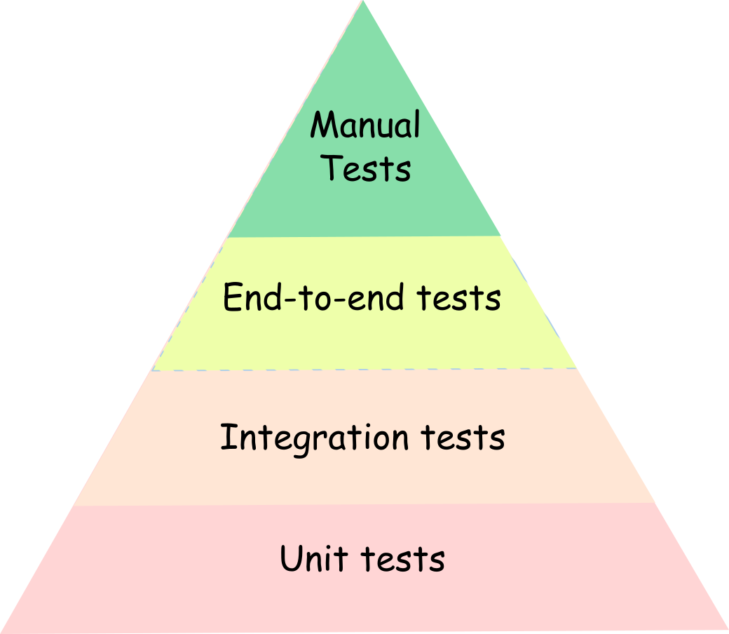 The bottom levels are narrow and cover a limited amount of code at a time, but it is easy to write and debug failures. As you move up, the code under test increases with lots of logic stacking over each other. A single run covers a lot of code at a time, but debugging failures become proportionately 🌵 tricky due to many more ⚙️ moving parts.
